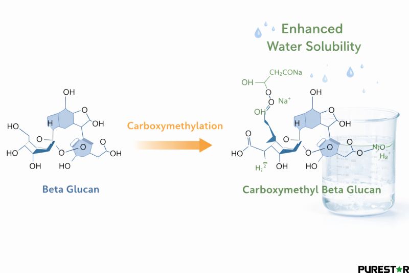 Carboxymethyl Yeast Beta Glucan Sodium is a modified derivative of yeast beta glucan produced through a carboxymethylation process. By introducing carboxymethyl groups into the hydroxyl groups of beta glucan, its water solubility is significantly enhanced, making it more suitable for a wide range of formulations. The final product is typically present in the form of a sodium salt.